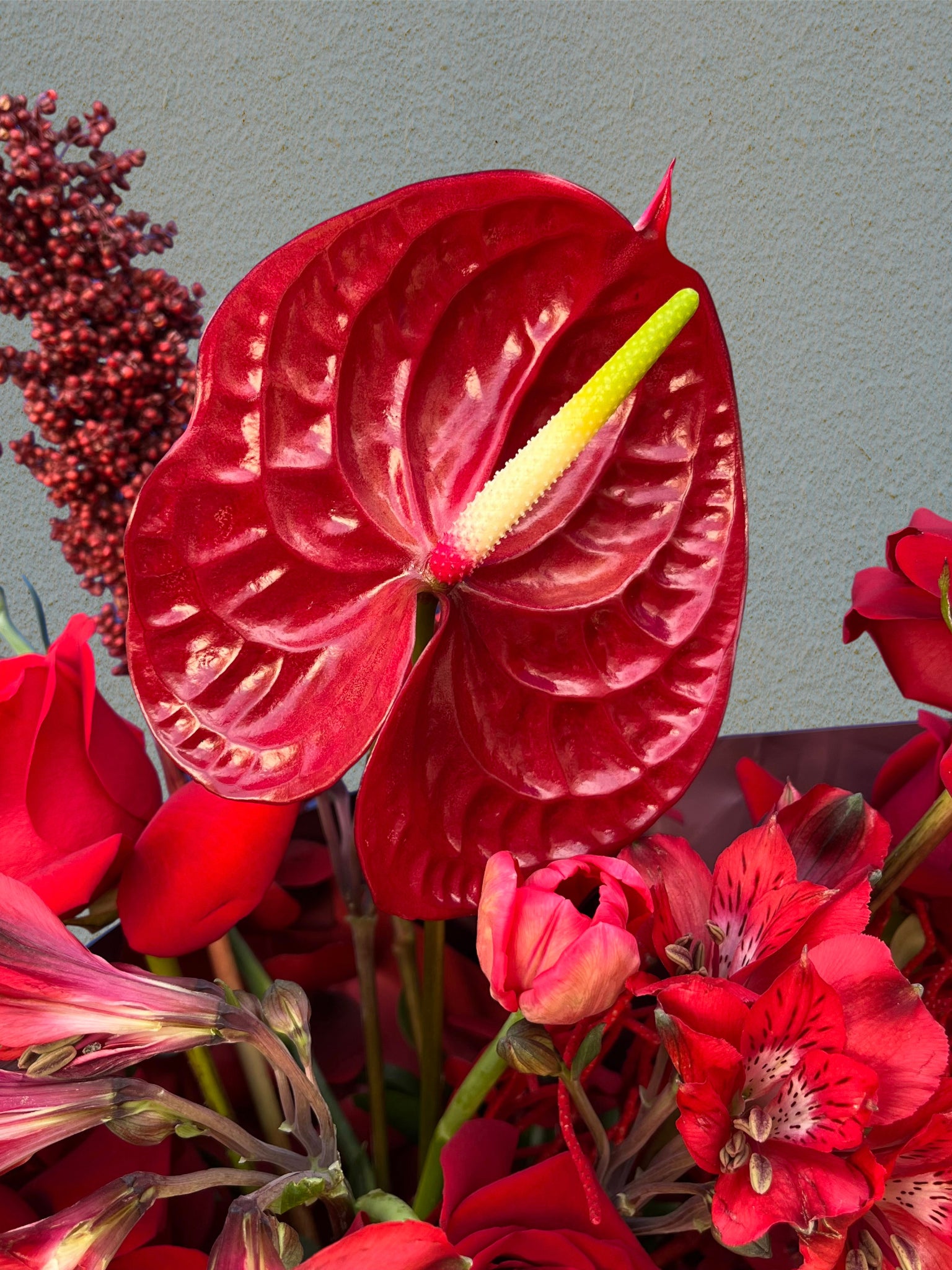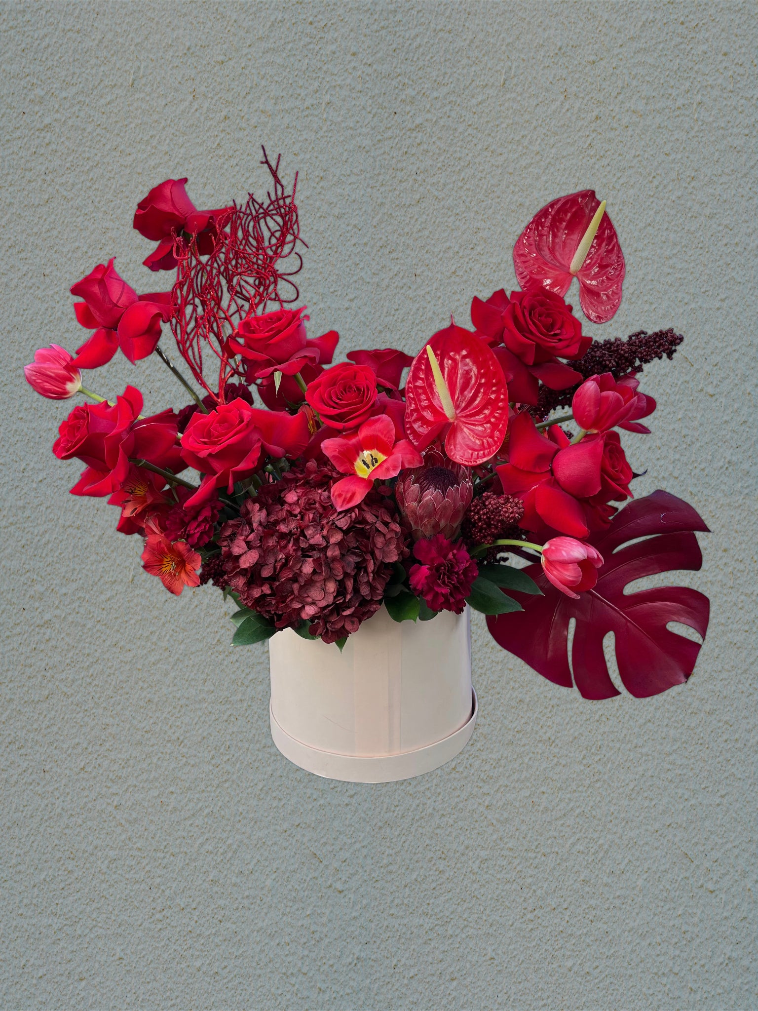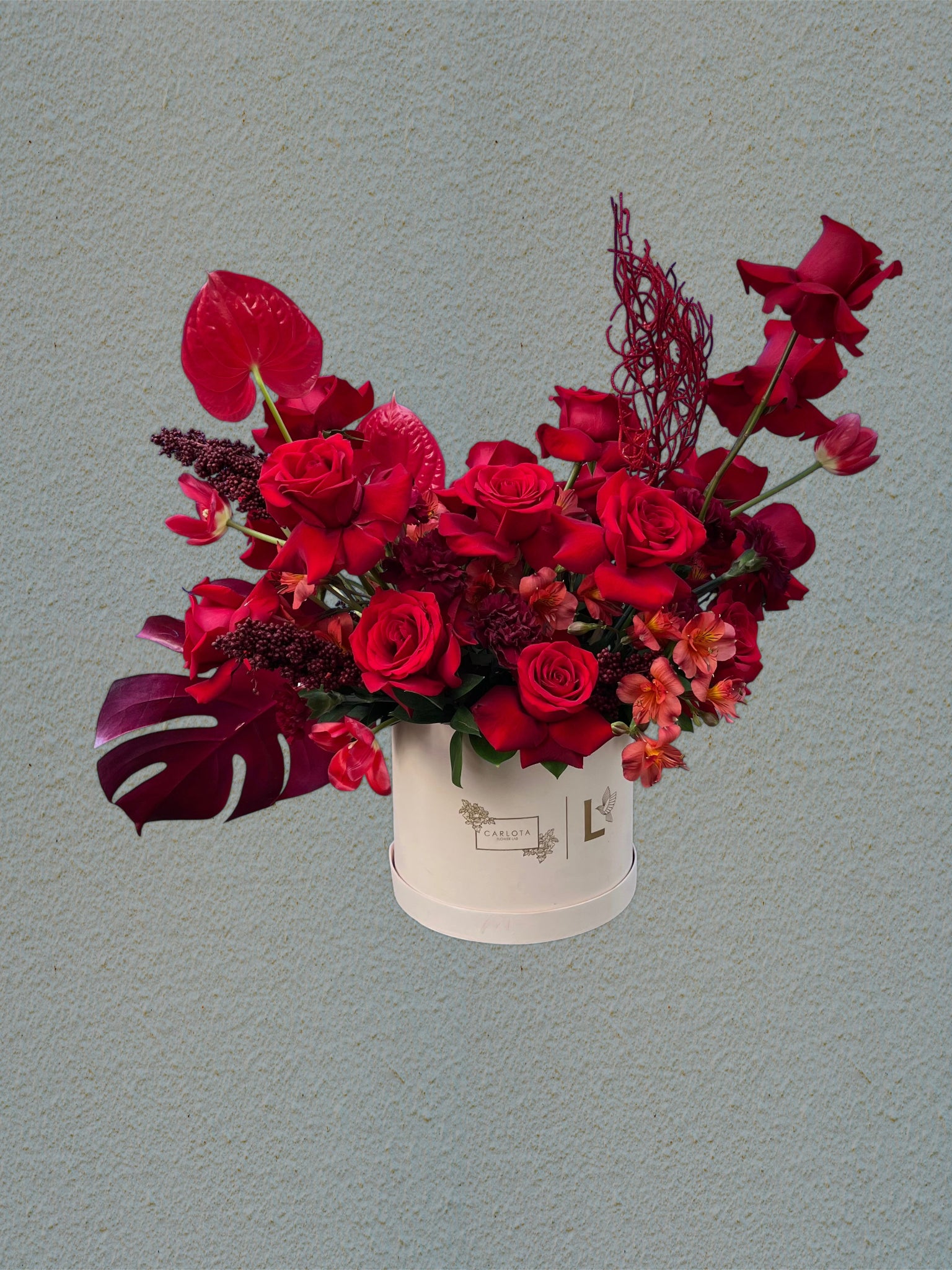 Rouge es un diseño impactante que celebra la intensidad de las emociones. En un solo tono, este arreglo logra una profundidad expresiva que dice mucho sin palabras. Perfecto para sorprender, seducir o declarar con fuerza lo que se siente.